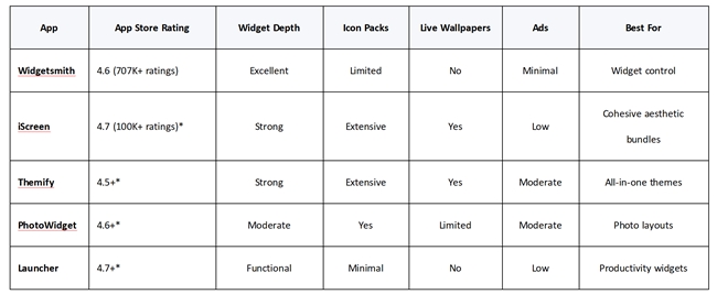 Key takeaway: Widgetsmith leads in widget control depth, while iScreen lead in bundled visual ecosystems.